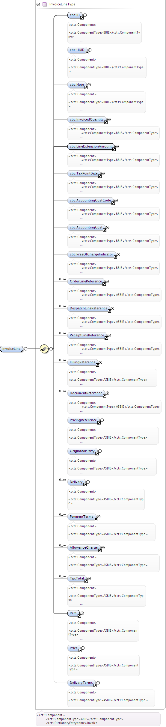 <xsd:complexType name="InvoiceLineType"><xsd:annotation><xsd:documentation><ccts:Component><ccts:ComponentType>ABIE</ccts:ComponentType><ccts:DictionaryEntryName>Invoice Line. Details</ccts:DictionaryEntryName><ccts:Definition>Information about an Invoice Line.</ccts:Definition><ccts:ObjectClass>Invoice Line</ccts:ObjectClass></ccts:Component></xsd:documentation></xsd:annotation><xsd:sequence><xsd:element ref="cbc:ID" minOccurs="1" maxOccurs="1"><xsd:annotation><xsd:documentation><ccts:Component><ccts:ComponentType>BBIE</ccts:ComponentType><ccts:DictionaryEntryName>Invoice Line. Identifier</ccts:DictionaryEntryName><ccts:Definition>Identifies the Invoice Line.</ccts:Definition><ccts:Cardinality>1</ccts:Cardinality><ccts:ObjectClass>Invoice Line</ccts:ObjectClass><ccts:PropertyTerm>Identifier</ccts:PropertyTerm><ccts:RepresentationTerm>Identifier</ccts:RepresentationTerm><ccts:DataType>Identifier. Type</ccts:DataType></ccts:Component></xsd:documentation></xsd:annotation></xsd:element><xsd:element ref="cbc:UUID" minOccurs="0" maxOccurs="1"><xsd:annotation><xsd:documentation><ccts:Component><ccts:ComponentType>BBIE</ccts:ComponentType><ccts:DictionaryEntryName>Invoice Line. UUID. Identifier</ccts:DictionaryEntryName><ccts:Definition>A universally unique identifier for an instance of this ABIE.</ccts:Definition><ccts:Cardinality>0..1</ccts:Cardinality><ccts:ObjectClass>Invoice Line</ccts:ObjectClass><ccts:PropertyTerm>UUID</ccts:PropertyTerm><ccts:RepresentationTerm>Identifier</ccts:RepresentationTerm><ccts:DataType>Identifier. Type</ccts:DataType></ccts:Component></xsd:documentation></xsd:annotation></xsd:element><xsd:element ref="cbc:Note" minOccurs="0" maxOccurs="1"><xsd:annotation><xsd:documentation><ccts:Component><ccts:ComponentType>BBIE</ccts:ComponentType><ccts:DictionaryEntryName>Invoice Line. Note. Text</ccts:DictionaryEntryName><ccts:Definition>Free-form text applying to the Invoice Line. This element may contain notes or any other similar information that is not contained explicitly in another structure.</ccts:Definition><ccts:Cardinality>0..1</ccts:Cardinality><ccts:ObjectClass>Invoice Line</ccts:ObjectClass><ccts:PropertyTerm>Note</ccts:PropertyTerm><ccts:RepresentationTerm>Text</ccts:RepresentationTerm><ccts:DataType>Text. Type</ccts:DataType></ccts:Component></xsd:documentation></xsd:annotation></xsd:element><xsd:element ref="cbc:InvoicedQuantity" minOccurs="0" maxOccurs="1"><xsd:annotation><xsd:documentation><ccts:Component><ccts:ComponentType>BBIE</ccts:ComponentType><ccts:DictionaryEntryName>Invoice Line. Invoiced_ Quantity. Quantity</ccts:DictionaryEntryName><ccts:Definition>The quantity (of Items) on the Invoice Line.</ccts:Definition><ccts:Cardinality>0..1</ccts:Cardinality><ccts:ObjectClass>Invoice Line</ccts:ObjectClass><ccts:PropertyTermQualifier>Invoiced</ccts:PropertyTermQualifier><ccts:PropertyTerm>Quantity</ccts:PropertyTerm><ccts:RepresentationTerm>Quantity</ccts:RepresentationTerm><ccts:DataType>Quantity. Type</ccts:DataType></ccts:Component></xsd:documentation></xsd:annotation></xsd:element><xsd:element ref="cbc:LineExtensionAmount" minOccurs="1" maxOccurs="1"><xsd:annotation><xsd:documentation><ccts:Component><ccts:ComponentType>BBIE</ccts:ComponentType><ccts:DictionaryEntryName>Invoice Line. Line Extension Amount. Amount</ccts:DictionaryEntryName><ccts:Definition>The total amount for the Invoice Line, including Allowance Charges but net of taxes.</ccts:Definition><ccts:Cardinality>1</ccts:Cardinality><ccts:ObjectClass>Invoice Line</ccts:ObjectClass><ccts:PropertyTerm>Line Extension Amount</ccts:PropertyTerm><ccts:RepresentationTerm>Amount</ccts:RepresentationTerm><ccts:DataType>Amount. Type</ccts:DataType></ccts:Component></xsd:documentation></xsd:annotation></xsd:element><xsd:element ref="cbc:TaxPointDate" minOccurs="0" maxOccurs="1"><xsd:annotation><xsd:documentation><ccts:Component><ccts:ComponentType>BBIE</ccts:ComponentType><ccts:DictionaryEntryName>Invoice Line. Tax Point Date. Date</ccts:DictionaryEntryName><ccts:Definition>The date of the Invoice Line, used to indicate the point at which tax becomes applicable.</ccts:Definition><ccts:Cardinality>0..1</ccts:Cardinality><ccts:ObjectClass>Invoice Line</ccts:ObjectClass><ccts:PropertyTerm>Tax Point Date</ccts:PropertyTerm><ccts:RepresentationTerm>Date</ccts:RepresentationTerm><ccts:DataType>Date. Type</ccts:DataType></ccts:Component></xsd:documentation></xsd:annotation></xsd:element><xsd:element ref="cbc:AccountingCostCode" minOccurs="0" maxOccurs="1"><xsd:annotation><xsd:documentation><ccts:Component><ccts:ComponentType>BBIE</ccts:ComponentType><ccts:DictionaryEntryName>Invoice Line. Accounting Cost Code. Code</ccts:DictionaryEntryName><ccts:Definition>The buyer's accounting code applied to the Invoice Line.</ccts:Definition><ccts:Cardinality>0..1</ccts:Cardinality><ccts:ObjectClass>Invoice Line</ccts:ObjectClass><ccts:PropertyTerm>Accounting Cost Code</ccts:PropertyTerm><ccts:RepresentationTerm>Code</ccts:RepresentationTerm><ccts:DataType>Code. Type</ccts:DataType></ccts:Component></xsd:documentation></xsd:annotation></xsd:element><xsd:element ref="cbc:AccountingCost" minOccurs="0" maxOccurs="1"><xsd:annotation><xsd:documentation><ccts:Component><ccts:ComponentType>BBIE</ccts:ComponentType><ccts:DictionaryEntryName>Invoice Line. Accounting Cost. Text</ccts:DictionaryEntryName><ccts:Definition>The buyer's accounting cost centre applied to the Invoice Line, expressed as text.</ccts:Definition><ccts:Cardinality>0..1</ccts:Cardinality><ccts:ObjectClass>Invoice Line</ccts:ObjectClass><ccts:PropertyTerm>Accounting Cost</ccts:PropertyTerm><ccts:RepresentationTerm>Text</ccts:RepresentationTerm><ccts:DataType>Text. Type</ccts:DataType></ccts:Component></xsd:documentation></xsd:annotation></xsd:element><xsd:element ref="cbc:FreeOfChargeIndicator" minOccurs="0" maxOccurs="1"><xsd:annotation><xsd:documentation><ccts:Component><ccts:ComponentType>BBIE</ccts:ComponentType><ccts:DictionaryEntryName>Invoice Line. Free