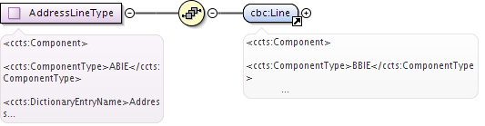 <xsd:complexType name="AddressLineType"><xsd:annotation><xsd:documentation><ccts:Component><ccts:ComponentType>ABIE</ccts:ComponentType><ccts:DictionaryEntryName>Address Line. Details</ccts:DictionaryEntryName><ccts:Definition>Information about a line of address expressed as unstructured text.</ccts:Definition><ccts:ObjectClass>Address Line</ccts:ObjectClass></ccts:Component></xsd:documentation></xsd:annotation><xsd:sequence><xsd:element ref="cbc:Line" minOccurs="1" maxOccurs="1"><xsd:annotation><xsd:documentation><ccts:Component><ccts:ComponentType>BBIE</ccts:ComponentType><ccts:DictionaryEntryName>Address Line. Line. Text</ccts:DictionaryEntryName><ccts:Definition>A line of address expressed as unstructured text.</ccts:Definition><ccts:Cardinality>1</ccts:Cardinality><ccts:ObjectClass>Address Line</ccts:ObjectClass><ccts:PropertyTerm>Line</ccts:PropertyTerm><ccts:RepresentationTerm>Text</ccts:RepresentationTerm><ccts:DataType>Text. Type</ccts:DataType><ccts:Examples>"123 Standard Chartered Tower"</ccts:Examples></ccts:Component></xsd:documentation></xsd:annotation></xsd:element></xsd:sequence></xsd:complexType>
