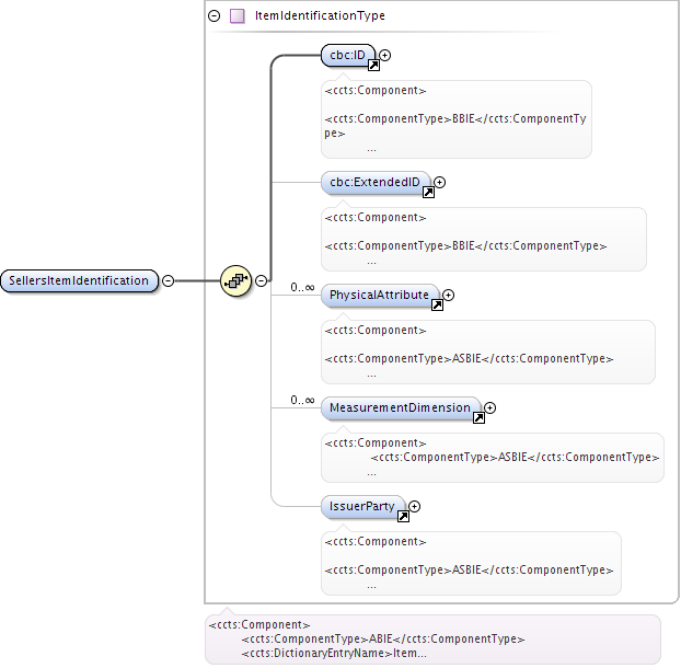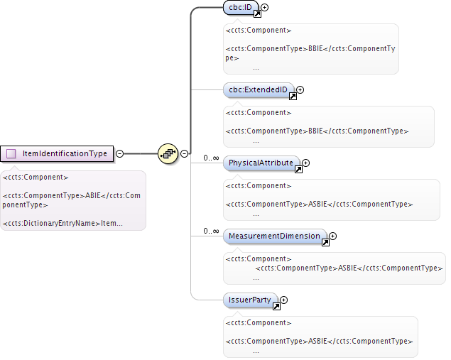 <xsd:complexType name="ItemIdentificationType"><xsd:annotation><xsd:documentation><ccts:Component><ccts:ComponentType>ABIE</ccts:ComponentType><ccts:DictionaryEntryName>Item Identification. Details</ccts:DictionaryEntryName><ccts:Definition>Information about item identification.</ccts:Definition><ccts:ObjectClass>Item Identification</ccts:ObjectClass></ccts:Component></xsd:documentation></xsd:annotation><xsd:sequence><xsd:element ref="cbc:ID" minOccurs="1" maxOccurs="1"><xsd:annotation><xsd:documentation><ccts:Component><ccts:ComponentType>BBIE</ccts:ComponentType><ccts:DictionaryEntryName>Item Identification. Identifier</ccts:DictionaryEntryName><ccts:Definition>An identifier for an item.</ccts:Definition><ccts:Cardinality>1</ccts:Cardinality><ccts:ObjectClass>Item Identification</ccts:ObjectClass><ccts:PropertyTerm>Identifier</ccts:PropertyTerm><ccts:RepresentationTerm>Identifier</ccts:RepresentationTerm><ccts:DataType>Identifier. Type</ccts:DataType><ccts:Examples>"CUST001" "3333-44-123"</ccts:Examples></ccts:Component></xsd:documentation></xsd:annotation></xsd:element><xsd:element ref="cbc:ExtendedID" minOccurs="0" maxOccurs="1"><xsd:annotation><xsd:documentation><ccts:Component><ccts:ComponentType>BBIE</ccts:ComponentType><ccts:DictionaryEntryName>Item Identification. Extended_ Identifier. Identifier</ccts:DictionaryEntryName><ccts:Definition>An extended identifier for the item that identifies the item with specific properties, e.g., Item 123 = Chair / Item 123 Ext 45 = brown chair.</ccts:Definition><ccts:Cardinality>0..1</ccts:Cardinality><ccts:ObjectClass>Item Identification</ccts:ObjectClass><ccts:PropertyTermQualifier>Extended</ccts:PropertyTermQualifier><ccts:PropertyTerm>Identifier</ccts:PropertyTerm><ccts:RepresentationTerm>Identifier</ccts:RepresentationTerm><ccts:DataType>Identifier. Type</ccts:DataType></ccts:Component></xsd:documentation></xsd:annotation></xsd:element><xsd:element ref="PhysicalAttribute" minOccurs="0" maxOccurs="unbounded"><xsd:annotation><xsd:documentation><ccts:Component><ccts:ComponentType>ASBIE</ccts:ComponentType><ccts:DictionaryEntryName>Item Identification. Physical Attribute</ccts:DictionaryEntryName><ccts:Definition>An association to Physical Attribute.</ccts:Definition><ccts:Cardinality>0..n</ccts:Cardinality><ccts:ObjectClass>Item Identification</ccts:ObjectClass><ccts:PropertyTerm>Physical Attribute</ccts:PropertyTerm><ccts:AssociatedObjectClass>Physical Attribute</ccts:AssociatedObjectClass></ccts:Component></xsd:documentation></xsd:annotation></xsd:element><xsd:element ref="MeasurementDimension" minOccurs="0" maxOccurs="unbounded"><xsd:annotation><xsd:documentation><ccts:Component><ccts:ComponentType>ASBIE</ccts:ComponentType><ccts:DictionaryEntryName>Item Identification. Measurement_ Dimension. Dimension</ccts:DictionaryEntryName><ccts:Definition>An association to Measurement Dimension.</ccts:Definition><ccts:Cardinality>0..n</ccts:Cardinality><ccts:ObjectClass>Item Identification</ccts:ObjectClass><ccts:PropertyTermQualifier>Measurement</ccts:PropertyTermQualifier><ccts:PropertyTerm>Dimension</ccts:PropertyTerm><ccts:AssociatedObjectClass>Dimension</ccts:AssociatedObjectClass></ccts:Component></xsd:documentation></xsd:annotation></xsd:element><xsd:element ref="IssuerParty" minOccurs="0" maxOccurs="1"><xsd:annotation><xsd:documentation><ccts:Component><ccts:ComponentType>ASBIE</ccts:ComponentType><ccts:DictionaryEntryName>Item Identification. Issuer_ Party. Party</ccts:DictionaryEntryName><ccts:Definition>An association to Issuer Party i.e. the Party that issued the Item Identification.</ccts:Definition><ccts:Cardinality>0..1</ccts:Cardinality><ccts:ObjectClass>Item Identification</ccts:ObjectClass><ccts:PropertyTermQualifier>Issuer</ccts:PropertyTermQualifier><ccts:PropertyTerm>Party</ccts:PropertyTerm><ccts:AssociatedObjectClass>Party</ccts:AssociatedObjectClass></ccts:Component></xsd:documentation></xsd:annotation></xsd:element></xsd:sequence></xsd:complexType>