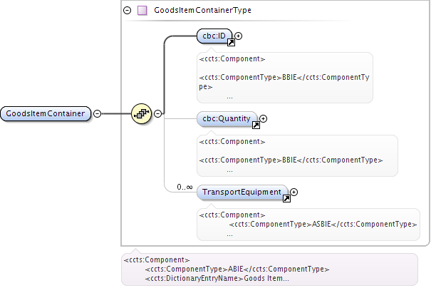 <xsd:complexType name="GoodsItemContainerType"><xsd:annotation><xsd:documentation><ccts:Component><ccts:ComponentType>ABIE</ccts:ComponentType><ccts:DictionaryEntryName>Goods Item Container. Details</ccts:DictionaryEntryName><ccts:Definition>How goods items are split across transport equipment.</ccts:Definition><ccts:ObjectClass>Goods Item Container</ccts:ObjectClass></ccts:Component></xsd:documentation></xsd:annotation><xsd:sequence><xsd:element ref="cbc:ID" minOccurs="1" maxOccurs="1"><xsd:annotation><xsd:documentation><ccts:Component><ccts:ComponentType>BBIE</ccts:ComponentType><ccts:DictionaryEntryName>Goods Item Container. Identifier</ccts:DictionaryEntryName><ccts:Definition>Identifies goods items split across transport equipment.</ccts:Definition><ccts:Cardinality>1</ccts:Cardinality><ccts:ObjectClass>Goods Item Container</ccts:ObjectClass><ccts:PropertyTerm>Identifier</ccts:PropertyTerm><ccts:RepresentationTerm>Identifier</ccts:RepresentationTerm><ccts:DataType>Identifier. Type</ccts:DataType></ccts:Component></xsd:documentation></xsd:annotation></xsd:element><xsd:element ref="cbc:Quantity" minOccurs="0" maxOccurs="1"><xsd:annotation><xsd:documentation><ccts:Component><ccts:ComponentType>BBIE</ccts:ComponentType><ccts:DictionaryEntryName>Goods Item Container. Quantity</ccts:DictionaryEntryName><ccts:Definition>Number of goods items loaded into or onto one piece of transport equipment as a total consignment or part of a consignment.</ccts:Definition><ccts:Cardinality>0..1</ccts:Cardinality><ccts:ObjectClass>Goods Item Container</ccts:ObjectClass><ccts:PropertyTerm>Quantity</ccts:PropertyTerm><ccts:RepresentationTerm>Quantity</ccts:RepresentationTerm><ccts:DataType>Quantity. Type</ccts:DataType><ccts:AlternativeBusinessTerms>Number of packages stuffed</ccts:AlternativeBusinessTerms></ccts:Component></xsd:documentation></xsd:annotation></xsd:element><xsd:element ref="TransportEquipment" minOccurs="0" maxOccurs="unbounded"><xsd:annotation><xsd:documentation><ccts:Component><ccts:ComponentType>ASBIE</ccts:ComponentType><ccts:DictionaryEntryName>Goods Item Container. Transport Equipment</ccts:DictionaryEntryName><ccts:Definition>Associates the containers for a single goods item.</ccts:Definition><ccts:Cardinality>0..n</ccts:Cardinality><ccts:ObjectClass>Goods Item Container</ccts:ObjectClass><ccts:PropertyTerm>Transport Equipment</ccts:PropertyTerm><ccts:AssociatedObjectClass>Transport Equipment</ccts:AssociatedObjectClass></ccts:Component></xsd:documentation></xsd:annotation></xsd:element></xsd:sequence></xsd:complexType>