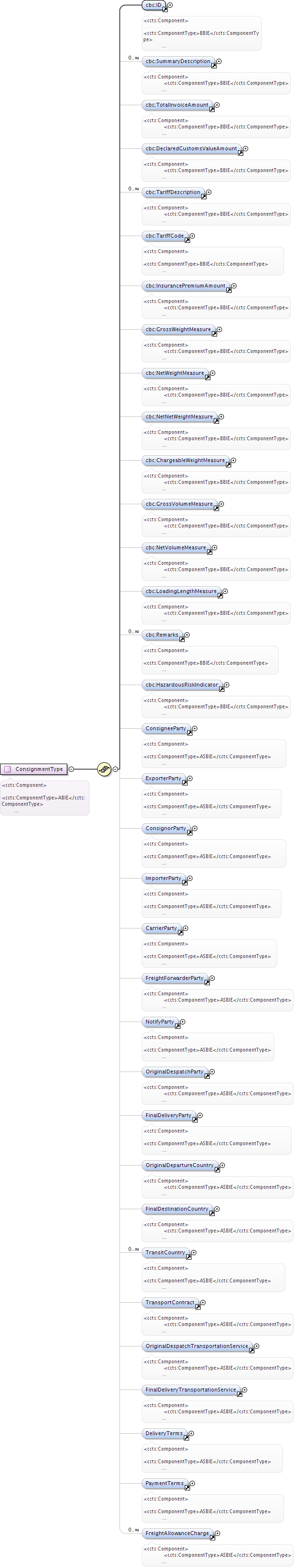 <xsd:complexType name="ConsignmentType"><xsd:annotation><xsd:documentation><ccts:Component><ccts:ComponentType>ABIE</ccts:ComponentType><ccts:DictionaryEntryName>Consignment. Details</ccts:DictionaryEntryName><ccts:Definition>An identifiable collection of one or more goods items to be transported between the consignor and the consignee. This information may be defined within a transport contract. A consignment may comprise more than one shipment (e.g., when consolidated by a freight forwarder).</ccts:Definition><ccts:ObjectClass>Consignment</ccts:ObjectClass></ccts:Component></xsd:documentation></xsd:annotation><xsd:sequence><xsd:element ref="cbc:ID" minOccurs="1" maxOccurs="1"><xsd:annotation><xsd:documentation><ccts:Component><ccts:ComponentType>BBIE</ccts:ComponentType><ccts:DictionaryEntryName>Consignment. Identifier</ccts:DictionaryEntryName><ccts:Definition>Unique number assigned to goods, both for import and export.</ccts:Definition><ccts:Cardinality>1</ccts:Cardinality><ccts:ObjectClass>Consignment</ccts:ObjectClass><ccts:PropertyTerm>Identifier</ccts:PropertyTerm><ccts:RepresentationTerm>Identifier</ccts:RepresentationTerm><ccts:DataType>Identifier. Type</ccts:DataType><ccts:AlternativeBusinessTerms>Unique consignment reference number (UCR)</ccts:AlternativeBusinessTerms></ccts:Component></xsd:documentation></xsd:annotation></xsd:element><xsd:element ref="cbc:SummaryDescription" minOccurs="0" maxOccurs="unbounded"><xsd:annotation><xsd:documentation><ccts:Component><ccts:ComponentType>BBIE</ccts:ComponentType><ccts:DictionaryEntryName>Consignment. Summary_ Description. Text</ccts:DictionaryEntryName><ccts:Definition>General descriptive text that is not part of any remarks.</ccts:Definition><ccts:Cardinality>0..n</ccts:Cardinality><ccts:ObjectClass>Consignment</ccts:ObjectClass><ccts:PropertyTermQualifier>Summary</ccts:PropertyTermQualifier><ccts:PropertyTerm>Description</ccts:PropertyTerm><ccts:RepresentationTerm>Text</ccts:RepresentationTerm><ccts:DataType>Text. Type</ccts:DataType></ccts:Component></xsd:documentation></xsd:annotation></xsd:element><xsd:element ref="cbc:TotalInvoiceAmount" minOccurs="0" maxOccurs="1"><xsd:annotation><xsd:documentation><ccts:Component><ccts:ComponentType>BBIE</ccts:ComponentType><ccts:DictionaryEntryName>Consignment. Total_ Invoice Amount. Amount</ccts:DictionaryEntryName><ccts:Definition>Total of all invoice amounts declared in a single consignment.</ccts:Definition><ccts:Cardinality>0..1</ccts:Cardinality><ccts:ObjectClass>Consignment</ccts:ObjectClass><ccts:PropertyTermQualifier>Total</ccts:PropertyTermQualifier><ccts:PropertyTerm>Invoice Amount</ccts:PropertyTerm><ccts:RepresentationTerm>Amount</ccts:RepresentationTerm><ccts:DataType>Amount. Type</ccts:DataType></ccts:Component></xsd:documentation></xsd:annotation></xsd:element><xsd:element ref="cbc:DeclaredCustomsValueAmount" minOccurs="0" maxOccurs="1"><xsd:annotation><xsd:documentation><ccts:Component><ccts:ComponentType>BBIE</ccts:ComponentType><ccts:DictionaryEntryName>Consignment. Declared Customs_ Value. Amount</ccts:DictionaryEntryName><ccts:Definition>Amount declared for customs purposes of those goods in a consignment, whether or not they are subject to the same customs procedure, tariff/statistical heading, country information, and duty regime.</ccts:Definition><ccts:Cardinality>0..1</ccts:Cardinality><ccts:ObjectClass>Consignment</ccts:ObjectClass><ccts:PropertyTermQualifier>Declared Customs</ccts:PropertyTermQualifier><ccts:PropertyTerm>Value</ccts:PropertyTerm><ccts:RepresentationTerm>Amount</ccts:RepresentationTerm><ccts:DataType>Amount. Type</ccts:DataType></ccts:Component></xsd:documentation></xsd:annotation></xsd:element><xsd:element ref="cbc:TariffDescription" minOccurs="0" maxOccurs="unbounded"><xsd:annotation><xsd:documentation><ccts:Component><ccts:ComponentType>BBIE</ccts:ComponentType><ccts:DictionaryEntryName>Consignment. Tariff Description. Text</ccts:DictionaryEntryName><ccts:Definition>A description of the tariff applied to a consignment.</ccts:Definition><ccts:Cardinality>0..n</ccts:Cardinality><ccts:ObjectClass>Consignment</ccts:ObjectClass><ccts:PropertyTerm>Tariff Description</ccts:PropertyTerm><ccts:RepresentationTerm>Text</ccts:RepresentationTerm><ccts:DataType>Text. Type</ccts:DataType></ccts:Component></xsd:documentation></xsd:annotation></xsd:element><xsd:element ref="cbc:TariffCode" minOccurs="0" maxOccurs="1"><xsd:annotation><xsd:documentation><ccts:Component><ccts:ComponentType>BBIE</ccts:ComponentType><ccts:DictionaryEntryName>Consignment. Tariff Code. Code</ccts:DictionaryEntryName><ccts:Definition>Code specifying a tariff applied to a consignment.</ccts:Definition><ccts:Cardinality>0..1</ccts:Cardinality><ccts:ObjectClass>Consignment</ccts:ObjectClass><ccts:PropertyTerm>Tariff Code</ccts:PropertyTerm><ccts:RepresentationTerm>Code</ccts:RepresentationTerm><ccts:DataType>Code. Type</ccts:DataType><ccts:AlternativeBusinessTerms>Tariff code number (WCO ID 145)</ccts:AlternativeBusinessTerms></ccts:Component></xsd:documentation></xsd:annotation></xsd:element><xsd:element ref="cbc:InsurancePremiumAmount" minOccurs="0" maxOccurs="1"><xsd:annotation><xsd:documentation><ccts:Component><ccts:ComponentType>BBIE</ccts:ComponentType><ccts:DictionaryEntryName>Consignment. Insurance Premium Amount. Amount</ccts:DictionaryEntryName><ccts:Definition>Amount of premium payable to the insurance company for insuring the goods.</ccts:Definition><ccts:Cardinality>0..1</ccts:Cardinality><ccts:ObjectClass>Consignment</ccts:ObjectClass><ccts:PropertyTerm>Insurance Premium Amount</ccts:PropertyTerm><ccts:RepresentationTerm>Amount</ccts:RepresentationTerm><ccts:DataType>Amount. Type</ccts:DataType><ccts:AlternativeBusinessTerms>Insurance Cost</ccts:AlternativeBusinessTerms></ccts:Component></xsd:documentation></xsd:annotation></xsd:element><xsd:element ref="cbc:GrossWeightMeasure" minOccurs="0" maxOccurs="1"><xsd:annotation><xsd:documentation><ccts:Component><ccts:ComponentType