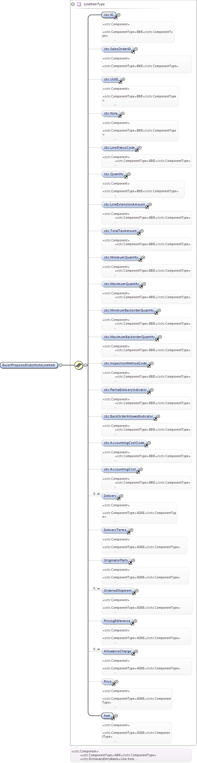 <xsd:complexType name="LineItemType"><xsd:annotation><xsd:documentation><ccts:Component><ccts:ComponentType>ABIE</ccts:ComponentType><ccts:DictionaryEntryName>Line Item. Details</ccts:DictionaryEntryName><ccts:Definition>Information about a Line Item.</ccts:Definition><ccts:ObjectClass>Line Item</ccts:ObjectClass></ccts:Component></xsd:documentation></xsd:annotation><xsd:sequence><xsd:element ref="cbc:ID" minOccurs="1" maxOccurs="1"><xsd:annotation><xsd:documentation><ccts:Component><ccts:ComponentType>BBIE</ccts:ComponentType><ccts:DictionaryEntryName>Line Item. Identifier</ccts:DictionaryEntryName><ccts:Definition>Identifies the Line Item assigned by the buyer.</ccts:Definition><ccts:Cardinality>1</ccts:Cardinality><ccts:ObjectClass>Line Item</ccts:ObjectClass><ccts:PropertyTerm>Identifier</ccts:PropertyTerm><ccts:RepresentationTerm>Identifier</ccts:RepresentationTerm><ccts:DataType>Identifier. Type</ccts:DataType></ccts:Component></xsd:documentation></xsd:annotation></xsd:element><xsd:element ref="cbc:SalesOrderID" minOccurs="0" maxOccurs="1"><xsd:annotation><xsd:documentation><ccts:Component><ccts:ComponentType>BBIE</ccts:ComponentType><ccts:DictionaryEntryName>Line Item. Sales_ Order Identifier. Identifier</ccts:DictionaryEntryName><ccts:Definition>The identification given to a Line by the seller.</ccts:Definition><ccts:Cardinality>0..1</ccts:Cardinality><ccts:ObjectClass>Line Item</ccts:ObjectClass><ccts:PropertyTermQualifier>Sales</ccts:PropertyTermQualifier><ccts:PropertyTerm>Order Identifier</ccts:PropertyTerm><ccts:RepresentationTerm>Identifier</ccts:RepresentationTerm><ccts:DataType>Identifier. Type</ccts:DataType></ccts:Component></xsd:documentation></xsd:annotation></xsd:element><xsd:element ref="cbc:UUID" minOccurs="0" maxOccurs="1"><xsd:annotation><xsd:documentation><ccts:Component><ccts:ComponentType>BBIE</ccts:ComponentType><ccts:DictionaryEntryName>Line Item. UUID. Identifier</ccts:DictionaryEntryName><ccts:Definition>A universally unique identifier for an instance of this ABIE.</ccts:Definition><ccts:Cardinality>0..1</ccts:Cardinality><ccts:ObjectClass>Line Item</ccts:ObjectClass><ccts:PropertyTerm>UUID</ccts:PropertyTerm><ccts:RepresentationTerm>Identifier</ccts:RepresentationTerm><ccts:DataType>Identifier. Type</ccts:DataType></ccts:Component></xsd:documentation></xsd:annotation></xsd:element><xsd:element ref="cbc:Note" minOccurs="0" maxOccurs="1"><xsd:annotation><xsd:documentation><ccts:Component><ccts:ComponentType>BBIE</ccts:ComponentType><ccts:DictionaryEntryName>Line Item. Note. Text</ccts:DictionaryEntryName><ccts:Definition>Free-form text applying to the Line Item. This element may contain notes or any other similar information that is not contained explicitly in another structure.</ccts:Definition><ccts:Cardinality>0..1</ccts:Cardinality><ccts:ObjectClass>Line Item</ccts:ObjectClass><ccts:PropertyTerm>Note</ccts:PropertyTerm><ccts:RepresentationTerm>Text</ccts:RepresentationTerm><ccts:DataType>Text. Type</ccts:DataType></ccts:Component></xsd:documentation></xsd:annotation></xsd:element><xsd:element ref="cbc:LineStatusCode" minOccurs="0" maxOccurs="1"><xsd:annotation><xsd:documentation><ccts:Component><ccts:ComponentType>BBIE</ccts:ComponentType><ccts:DictionaryEntryName>Line Item. Line Status Code. Code</ccts:DictionaryEntryName><ccts:Definition>Identifies the status of the Line with respect to its original state.</ccts:Definition><ccts:Cardinality>0..1</ccts:Cardinality><ccts:ObjectClass>Line Item</ccts:ObjectClass><ccts:PropertyTerm>Line Status Code</ccts:PropertyTerm><ccts:RepresentationTerm>Code</ccts:RepresentationTerm><ccts:DataType>Line Status_ Code. Type</ccts:DataType></ccts:Component></xsd:documentation></xsd:annotation></xsd:element><xsd:element ref="cbc:Quantity" minOccurs="0" maxOccurs="1"><xsd:annotation><xsd:documentation><ccts:Component><ccts:ComponentType>BBIE</ccts:ComponentType><ccts:DictionaryEntryName>Line Item. Quantity</ccts:DictionaryEntryName><ccts:Definition>The quantity of Items for the Line Item.</ccts:Definition><ccts:Cardinality>0..1</ccts:Cardinality><ccts:ObjectClass>Line Item</ccts:ObjectClass><ccts:PropertyTerm>Quantity</ccts:PropertyTerm><ccts:RepresentationTerm>Quantity</ccts:RepresentationTerm><ccts:DataType>Quantity. Type</ccts:DataType></ccts:Component></xsd:documentation></xsd:annotation></xsd:element><xsd:element ref="cbc:LineExtensionAmount" minOccurs="0" maxOccurs="1"><xsd:annotation><xsd:documentation><ccts:Component><ccts:ComponentType>BBIE</ccts:ComponentType><ccts:DictionaryEntryName>Line Item. Line Extension Amount. Amount</ccts:DictionaryEntryName><ccts:Definition>The total amount for the Line Item, including Allowance Charges but net of taxes.</ccts:Definition><ccts:Cardinality>0..1</ccts:Cardinality><ccts:ObjectClass>Line Item</ccts:ObjectClass><ccts:PropertyTerm>Line Extension Amount</ccts:PropertyTerm><ccts:RepresentationTerm>Amount</ccts:RepresentationTerm><ccts:DataType>Amount. Type</ccts:DataType></ccts:Component></xsd:documentation></xsd:annotation></xsd:element><xsd:element ref="cbc:TotalTaxAmount" minOccurs="0" maxOccurs="1"><xsd:annotation><xsd:documentation><ccts:Component><ccts:ComponentType>BBIE</ccts:ComponentType><ccts:DictionaryEntryName>Line Item. Total_ Tax Amount. Amount</ccts:DictionaryEntryName><ccts:Definition>The total tax amount for the Line Item.</ccts:Definition><ccts:Cardinality>0..1</ccts:Cardinality><ccts:ObjectClass>Line Item</ccts:ObjectClass><ccts:PropertyTermQualifier>Total</ccts:PropertyTermQualifier><ccts:PropertyTerm>Tax Amount</ccts:PropertyTerm><ccts:RepresentationTerm>Amount</ccts:RepresentationTerm><ccts:DataType>Amount. Type</ccts:DataType></ccts:Component></xsd:documentation></xsd:annotation></xsd:element><xsd:element ref="cbc:MinimumQuantity" minOccurs="0" maxOccurs="1"><xsd:annotation><xsd:documentation><ccts:Component><ccts:ComponentType>BBIE</ccts:ComponentType><ccts:DictionaryEntryName>Line Item. Minimum_ Quantity. Quantity</ccts:DictionaryEntryName><ccts:Definiti