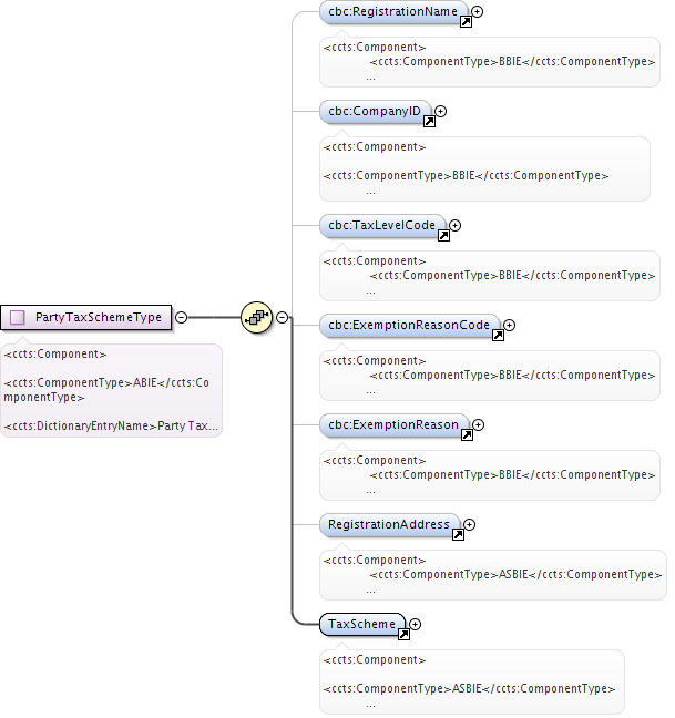 <xsd:complexType name="PartyTaxSchemeType"><xsd:annotation><xsd:documentation><ccts:Component><ccts:ComponentType>ABIE</ccts:ComponentType><ccts:DictionaryEntryName>Party Tax Scheme. Details</ccts:DictionaryEntryName><ccts:Definition>Information about a party's Tax Scheme.</ccts:Definition><ccts:ObjectClass>Party Tax Scheme</ccts:ObjectClass></ccts:Component></xsd:documentation></xsd:annotation><xsd:sequence><xsd:element ref="cbc:RegistrationName" minOccurs="0" maxOccurs="1"><xsd:annotation><xsd:documentation><ccts:Component><ccts:ComponentType>BBIE</ccts:ComponentType><ccts:DictionaryEntryName>Party Tax Scheme. Registration_ Name. Name</ccts:DictionaryEntryName><ccts:Definition>The official name of the party as registered with the relevant fiscal authority.</ccts:Definition><ccts:Cardinality>0..1</ccts:Cardinality><ccts:ObjectClass>Party Tax Scheme</ccts:ObjectClass><ccts:PropertyTermQualifier>Registration</ccts:PropertyTermQualifier><ccts:PropertyTerm>Name</ccts:PropertyTerm><ccts:RepresentationTerm>Name</ccts:RepresentationTerm><ccts:DataType>Name. Type</ccts:DataType><ccts:Examples>"Microsoft Corporation"</ccts:Examples></ccts:Component></xsd:documentation></xsd:annotation></xsd:element><xsd:element ref="cbc:CompanyID" minOccurs="0" maxOccurs="1"><xsd:annotation><xsd:documentation><ccts:Component><ccts:ComponentType>BBIE</ccts:ComponentType><ccts:DictionaryEntryName>Party Tax Scheme. Company Identifier. Identifier</ccts:DictionaryEntryName><ccts:Definition>The identifier assigned for tax purposes to a party by the taxation authority.</ccts:Definition><ccts:Cardinality>0..1</ccts:Cardinality><ccts:ObjectClass>Party Tax Scheme</ccts:ObjectClass><ccts:PropertyTerm>Company Identifier</ccts:PropertyTerm><ccts:RepresentationTerm>Identifier</ccts:RepresentationTerm><ccts:DataType>Identifier. Type</ccts:DataType><ccts:AlternativeBusinessTerms>VAT Number</ccts:AlternativeBusinessTerms><ccts:Examples>"3556625"</ccts:Examples></ccts:Component></xsd:documentation></xsd:annotation></xsd:element><xsd:element ref="cbc:TaxLevelCode" minOccurs="0" maxOccurs="1"><xsd:annotation><xsd:documentation><ccts:Component><ccts:ComponentType>BBIE</ccts:ComponentType><ccts:DictionaryEntryName>Party Tax Scheme. Tax Level Code. Code</ccts:DictionaryEntryName><ccts:Definition>The section or role within the tax scheme that applies to the party.</ccts:Definition><ccts:Cardinality>0..1</ccts:Cardinality><ccts:ObjectClass>Party Tax Scheme</ccts:ObjectClass><ccts:PropertyTerm>Tax Level Code</ccts:PropertyTerm><ccts:RepresentationTerm>Code</ccts:RepresentationTerm><ccts:DataType>Code. Type</ccts:DataType></ccts:Component></xsd:documentation></xsd:annotation></xsd:element><xsd:element ref="cbc:ExemptionReasonCode" minOccurs="0" maxOccurs="1"><xsd:annotation><xsd:documentation><ccts:Component><ccts:ComponentType>BBIE</ccts:ComponentType><ccts:DictionaryEntryName>Party Tax Scheme. Exemption Reason Code. Code</ccts:DictionaryEntryName><ccts:Definition>A reason for a party's exemption from tax, expressed as a code.</ccts:Definition><ccts:Cardinality>0..1</ccts:Cardinality><ccts:ObjectClass>Party Tax Scheme</ccts:ObjectClass><ccts:PropertyTerm>Exemption Reason Code</ccts:PropertyTerm><ccts:RepresentationTerm>Code</ccts:RepresentationTerm><ccts:DataType>Code. Type</ccts:DataType></ccts:Component></xsd:documentation></xsd:annotation></xsd:element><xsd:element ref="cbc:ExemptionReason" minOccurs="0" maxOccurs="1"><xsd:annotation><xsd:documentation><ccts:Component><ccts:ComponentType>BBIE</ccts:ComponentType><ccts:DictionaryEntryName>Party Tax Scheme. Exemption_ Reason. Text</ccts:DictionaryEntryName><ccts:Definition>A reason for a party's exemption from tax, expressed as text.</ccts:Definition><ccts:Cardinality>0..1</ccts:Cardinality><ccts:ObjectClass>Party Tax Scheme</ccts:ObjectClass><ccts:PropertyTermQualifier>Exemption</ccts:PropertyTermQualifier><ccts:PropertyTerm>Reason</ccts:PropertyTerm><ccts:RepresentationTerm>Text</ccts:RepresentationTerm><ccts:DataType>Text. Type</ccts:DataType></ccts:Component></xsd:documentation></xsd:annotation></xsd:element><xsd:element ref="RegistrationAddress" minOccurs="0" maxOccurs="1"><xsd:annotation><xsd:documentation><ccts:Component><ccts:ComponentType>ASBIE</ccts:ComponentType><ccts:DictionaryEntryName>Party Tax Scheme. Registration_ Address. Address</ccts:DictionaryEntryName><ccts:Definition>An association to Registered Address (for tax purposes).</ccts:Definition><ccts:Cardinality>0..1</ccts:Cardinality><ccts:ObjectClass>Party Tax Scheme</ccts:ObjectClass><ccts:PropertyTermQualifier>Registration</ccts:PropertyTermQualifier><ccts:PropertyTerm>Address</ccts:PropertyTerm><ccts:AssociatedObjectClass>Address</ccts:AssociatedObjectClass></ccts:Component></xsd:documentation></xsd:annotation></xsd:element><xsd:element ref="TaxScheme" minOccurs="1" maxOccurs="1"><xsd:annotation><xsd:documentation><ccts:Component><ccts:ComponentType>ASBIE</ccts:ComponentType><ccts:DictionaryEntryName>Party Tax Scheme. Tax Scheme</ccts:DictionaryEntryName><ccts:Definition>An association to Tax Scheme.</ccts:Definition><ccts:Cardinality>1</ccts:Cardinality><ccts:ObjectClass>Party Tax Scheme</ccts:ObjectClass><ccts:PropertyTerm>Tax Scheme</ccts:PropertyTerm><ccts:AssociatedObjectClass>Tax Scheme</ccts:AssociatedObjectClass></ccts:Component></xsd:documentation></xsd:annotation></xsd:element></xsd:sequence></xsd:complexType>