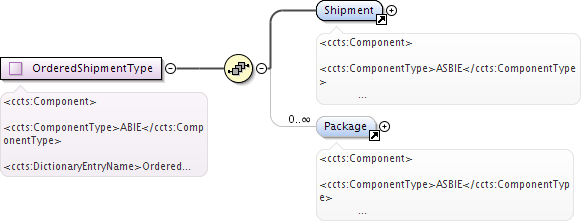 <xsd:complexType name="OrderedShipmentType"><xsd:annotation><xsd:documentation><ccts:Component><ccts:ComponentType>ABIE</ccts:ComponentType><ccts:DictionaryEntryName>Ordered Shipment. Details</ccts:DictionaryEntryName><ccts:Definition>Information about an Ordered Shipment.</ccts:Definition><ccts:ObjectClass>Ordered Shipment</ccts:ObjectClass></ccts:Component></xsd:documentation></xsd:annotation><xsd:sequence><xsd:element ref="Shipment" minOccurs="1" maxOccurs="1"><xsd:annotation><xsd:documentation><ccts:Component><ccts:ComponentType>ASBIE</ccts:ComponentType><ccts:DictionaryEntryName>Ordered Shipment. Shipment</ccts:DictionaryEntryName><ccts:Definition>An association to Shipment.</ccts:Definition><ccts:Cardinality>1</ccts:Cardinality><ccts:ObjectClass>Ordered Shipment</ccts:ObjectClass><ccts:PropertyTerm>Shipment</ccts:PropertyTerm><ccts:AssociatedObjectClass>Shipment</ccts:AssociatedObjectClass></ccts:Component></xsd:documentation></xsd:annotation></xsd:element><xsd:element ref="Package" minOccurs="0" maxOccurs="unbounded"><xsd:annotation><xsd:documentation><ccts:Component><ccts:ComponentType>ASBIE</ccts:ComponentType><ccts:DictionaryEntryName>Ordered Shipment. Package</ccts:DictionaryEntryName><ccts:Definition>An association to Package.</ccts:Definition><ccts:Cardinality>0..n</ccts:Cardinality><ccts:ObjectClass>Ordered Shipment</ccts:ObjectClass><ccts:PropertyTerm>Package</ccts:PropertyTerm><ccts:AssociatedObjectClass>Package</ccts:AssociatedObjectClass></ccts:Component></xsd:documentation></xsd:annotation></xsd:element></xsd:sequence></xsd:complexType>