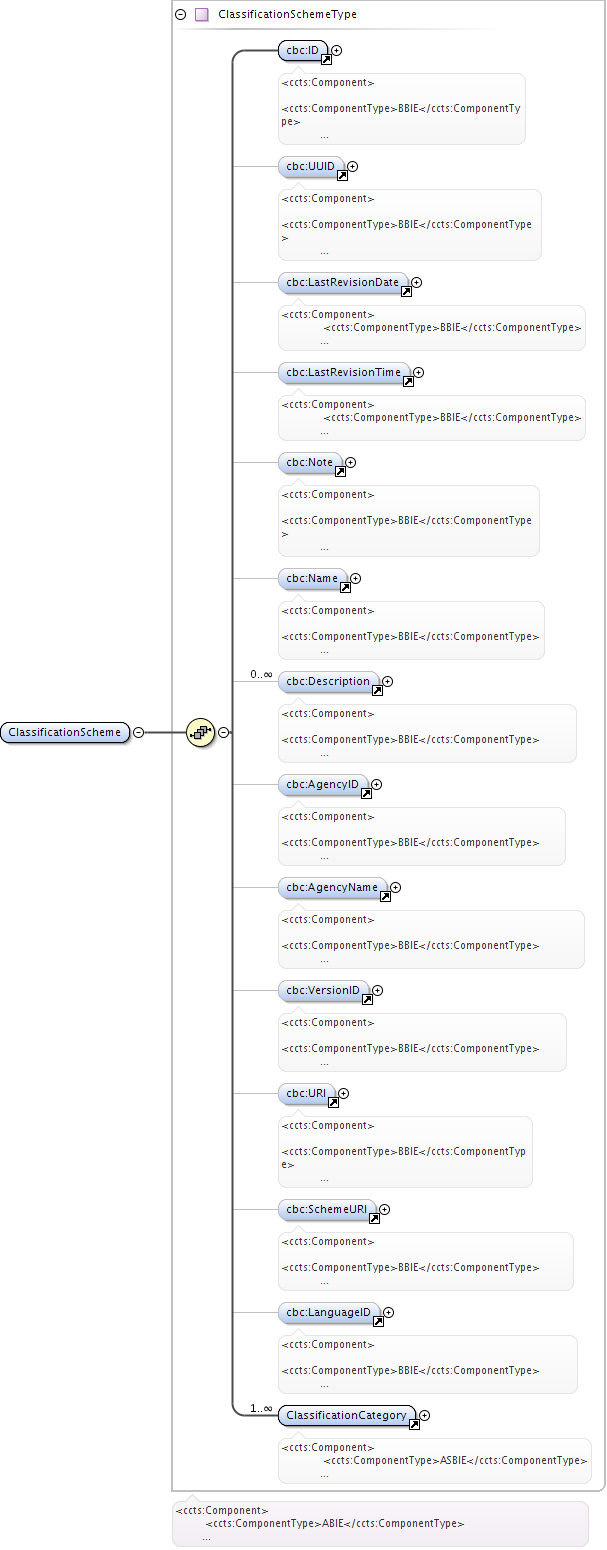 <xsd:complexType name="ClassificationSchemeType"><xsd:annotation><xsd:documentation><ccts:Component><ccts:ComponentType>ABIE</ccts:ComponentType><ccts:DictionaryEntryName>Classification Scheme. Details</ccts:DictionaryEntryName><ccts:Definition>Information about Classification Scheme; a scheme that defines a taxonomy for classifying goods or services.</ccts:Definition><ccts:ObjectClass>Classification Scheme</ccts:ObjectClass></ccts:Component></xsd:documentation></xsd:annotation><xsd:sequence><xsd:element ref="cbc:ID" minOccurs="1" maxOccurs="1"><xsd:annotation><xsd:documentation><ccts:Component><ccts:ComponentType>BBIE</ccts:ComponentType><ccts:DictionaryEntryName>Classification Scheme. Identifier</ccts:DictionaryEntryName><ccts:Definition>An identifier for the classification scheme.</ccts:Definition><ccts:Cardinality>1</ccts:Cardinality><ccts:ObjectClass>Classification Scheme</ccts:ObjectClass><ccts:PropertyTerm>Identifier</ccts:PropertyTerm><ccts:RepresentationTerm>Identifier</ccts:RepresentationTerm><ccts:DataType>Identifier. Type</ccts:DataType></ccts:Component></xsd:documentation></xsd:annotation></xsd:element><xsd:element ref="cbc:UUID" minOccurs="0" maxOccurs="1"><xsd:annotation><xsd:documentation><ccts:Component><ccts:ComponentType>BBIE</ccts:ComponentType><ccts:DictionaryEntryName>Classification Scheme. UUID. Identifier</ccts:DictionaryEntryName><ccts:Definition>A universally unique identifier for an instance of this ABIE.</ccts:Definition><ccts:Cardinality>0..1</ccts:Cardinality><ccts:ObjectClass>Classification Scheme</ccts:ObjectClass><ccts:PropertyTerm>UUID</ccts:PropertyTerm><ccts:RepresentationTerm>Identifier</ccts:RepresentationTerm><ccts:DataType>Identifier. Type</ccts:DataType></ccts:Component></xsd:documentation></xsd:annotation></xsd:element><xsd:element ref="cbc:LastRevisionDate" minOccurs="0" maxOccurs="1"><xsd:annotation><xsd:documentation><ccts:Component><ccts:ComponentType>BBIE</ccts:ComponentType><ccts:DictionaryEntryName>Classification Scheme. Last_ Revision Date. Date</ccts:DictionaryEntryName><ccts:Definition>The date at which the classification scheme was last revised.</ccts:Definition><ccts:Cardinality>0..1</ccts:Cardinality><ccts:ObjectClass>Classification Scheme</ccts:ObjectClass><ccts:PropertyTermQualifier>Last</ccts:PropertyTermQualifier><ccts:PropertyTerm>Revision Date</ccts:PropertyTerm><ccts:RepresentationTerm>Date</ccts:RepresentationTerm><ccts:DataType>Date. Type</ccts:DataType></ccts:Component></xsd:documentation></xsd:annotation></xsd:element><xsd:element ref="cbc:LastRevisionTime" minOccurs="0" maxOccurs="1"><xsd:annotation><xsd:documentation><ccts:Component><ccts:ComponentType>BBIE</ccts:ComponentType><ccts:DictionaryEntryName>Classification Scheme. Last_ Revision Time. Time</ccts:DictionaryEntryName><ccts:Definition>The time at which the classification scheme was last revised.</ccts:Definition><ccts:Cardinality>0..1</ccts:Cardinality><ccts:ObjectClass>Classification Scheme</ccts:ObjectClass><ccts:PropertyTermQualifier>Last</ccts:PropertyTermQualifier><ccts:PropertyTerm>Revision Time</ccts:PropertyTerm><ccts:RepresentationTerm>Time</ccts:RepresentationTerm><ccts:DataType>Time. Type</ccts:DataType></ccts:Component></xsd:documentation></xsd:annotation></xsd:element><xsd:element ref="cbc:Note" minOccurs="0" maxOccurs="1"><xsd:annotation><xsd:documentation><ccts:Component><ccts:ComponentType>BBIE</ccts:ComponentType><ccts:DictionaryEntryName>Classification Scheme. Note. Text</ccts:DictionaryEntryName><ccts:Definition>Free-form text applying to the Classification Scheme. This element may contain notes or any other similar information that is not contained explicitly in another structure.</ccts:Definition><ccts:Cardinality>0..1</ccts:Cardinality><ccts:ObjectClass>Classification Scheme</ccts:ObjectClass><ccts:PropertyTerm>Note</ccts:PropertyTerm><ccts:RepresentationTerm>Text</ccts:RepresentationTerm><ccts:DataType>Text. Type</ccts:DataType></ccts:Component></xsd:documentation></xsd:annotation></xsd:element><xsd:element ref="cbc:Name" minOccurs="0" maxOccurs="1"><xsd:annotation><xsd:documentation><ccts:Component><ccts:ComponentType>BBIE</ccts:ComponentType><ccts:DictionaryEntryName>Classification Scheme. Name</ccts:DictionaryEntryName><ccts:Definition>The name of the Classification Scheme.</ccts:Definition><ccts:Cardinality>0..1</ccts:Cardinality><ccts:ObjectClass>Classification Scheme</ccts:ObjectClass><ccts:PropertyTerm>Name</ccts:PropertyTerm><ccts:RepresentationTerm>Name</ccts:RepresentationTerm><ccts:DataType>Name. Type</ccts:DataType><ccts:Examples>"UNSPSC"</ccts:Examples></ccts:Component></xsd:documentation></xsd:annotation></xsd:element><xsd:element ref="cbc:Description" minOccurs="0" maxOccurs="unbounded"><xsd:annotation><xsd:documentation><ccts:Component><ccts:ComponentType>BBIE</ccts:ComponentType><ccts:DictionaryEntryName>Classification Scheme. Description. Text</ccts:DictionaryEntryName><ccts:Definition>A description of the Classification Scheme.</ccts:Definition><ccts:Cardinality>0..n</ccts:Cardinality><ccts:ObjectClass>Classification Scheme</ccts:ObjectClass><ccts:PropertyTerm>Description</ccts:PropertyTerm><ccts:RepresentationTerm>Text</ccts:RepresentationTerm><ccts:DataType>Text. Type</ccts:DataType><ccts:Examples>"an open, global multi-sector standard for classification of products and services"</ccts:Examples></ccts:Component></xsd:documentation></xsd:annotation></xsd:element><xsd:element ref="cbc:AgencyID" minOccurs="0" maxOccurs="1"><xsd:annotation><xsd:documentation><ccts:Component><ccts:ComponentType>BBIE</ccts:ComponentType><ccts:DictionaryEntryName>Classification Scheme. Agency Identifier. Identifier</ccts:DictionaryEntryName><ccts:Definition>Identifies the agency that maintains the Classification Scheme.</ccts:Definition><ccts:Cardinality>0..1</ccts:Cardinality><ccts:ObjectClass>Classification Scheme</ccts:ObjectClass><ccts:PropertyTerm>Agency Identifier</ccts:PropertyTerm><ccts:RepresentationTerm>Identifier</ccts:Representatio