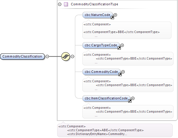 <xsd:complexType name="CommodityClassificationType"><xsd:annotation><xsd:documentation><ccts:Component><ccts:ComponentType>ABIE</ccts:ComponentType><ccts:DictionaryEntryName>Commodity Classification. Details</ccts:DictionaryEntryName><ccts:Definition>Information about Commodity Classification.</ccts:Definition><ccts:ObjectClass>Commodity Classification</ccts:ObjectClass></ccts:Component></xsd:documentation></xsd:annotation><xsd:sequence><xsd:element ref="cbc:NatureCode" minOccurs="0" maxOccurs="1"><xsd:annotation><xsd:documentation><ccts:Component><ccts:ComponentType>BBIE</ccts:ComponentType><ccts:DictionaryEntryName>Commodity Classification. Nature Code. Code</ccts:DictionaryEntryName><ccts:Definition>The high-level nature of the Classification issued by a specific maintenance agency, expressed as a code.</ccts:Definition><ccts:Cardinality>0..1</ccts:Cardinality><ccts:ObjectClass>Commodity Classification</ccts:ObjectClass><ccts:PropertyTerm>Nature Code</ccts:PropertyTerm><ccts:RepresentationTerm>Code</ccts:RepresentationTerm><ccts:DataType>Code. Type</ccts:DataType><ccts:Examples>"wooden products"</ccts:Examples></ccts:Component></xsd:documentation></xsd:annotation></xsd:element><xsd:element ref="cbc:CargoTypeCode" minOccurs="0" maxOccurs="1"><xsd:annotation><xsd:documentation><ccts:Component><ccts:ComponentType>BBIE</ccts:ComponentType><ccts:DictionaryEntryName>Commodity Classification. Cargo Type Code. Code</ccts:DictionaryEntryName><ccts:Definition>The type of cargo, expressed as a code.</ccts:Definition><ccts:Cardinality>0..1</ccts:Cardinality><ccts:ObjectClass>Commodity Classification</ccts:ObjectClass><ccts:PropertyTerm>Cargo Type Code</ccts:PropertyTerm><ccts:RepresentationTerm>Code</ccts:RepresentationTerm><ccts:DataType>Code. Type</ccts:DataType><ccts:Examples>"Refrigerated"</ccts:Examples></ccts:Component></xsd:documentation></xsd:annotation></xsd:element><xsd:element ref="cbc:CommodityCode" minOccurs="0" maxOccurs="1"><xsd:annotation><xsd:documentation><ccts:Component><ccts:ComponentType>BBIE</ccts:ComponentType><ccts:DictionaryEntryName>Commodity Classification. Commodity Code. Code</ccts:DictionaryEntryName><ccts:Definition>The harmonized international commodity code for regulatory (customs and trade statistics) purposes.</ccts:Definition><ccts:Cardinality>0..1</ccts:Cardinality><ccts:ObjectClass>Commodity Classification</ccts:ObjectClass><ccts:PropertyTerm>Commodity Code</ccts:PropertyTerm><ccts:RepresentationTerm>Code</ccts:RepresentationTerm><ccts:DataType>Code. Type</ccts:DataType><ccts:AlternativeBusinessTerms>Harmonized Code</ccts:AlternativeBusinessTerms><ccts:Examples>"1102222883"</ccts:Examples></ccts:Component></xsd:documentation></xsd:annotation></xsd:element><xsd:element ref="cbc:ItemClassificationCode" minOccurs="0" maxOccurs="1"><xsd:annotation><xsd:documentation><ccts:Component><ccts:ComponentType>BBIE</ccts:ComponentType><ccts:DictionaryEntryName>Commodity Classification. Item Classification Code. Code</ccts:DictionaryEntryName><ccts:Definition>The trade commodity classification, expressed as a code.</ccts:Definition><ccts:Cardinality>0..1</ccts:Cardinality><ccts:ObjectClass>Commodity Classification</ccts:ObjectClass><ccts:PropertyTerm>Item Classification Code</ccts:PropertyTerm><ccts:RepresentationTerm>Code</ccts:RepresentationTerm><ccts:DataType>Code. Type</ccts:DataType><ccts:AlternativeBusinessTerms>UN/SPSC Code</ccts:AlternativeBusinessTerms><ccts:Examples>"3440234"</ccts:Examples></ccts:Component></xsd:documentation></xsd:annotation></xsd:element></xsd:sequence></xsd:complexType>