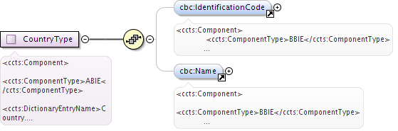 <xsd:complexType name="CountryType"><xsd:annotation><xsd:documentation><ccts:Component><ccts:ComponentType>ABIE</ccts:ComponentType><ccts:DictionaryEntryName>Country. Details</ccts:DictionaryEntryName><ccts:Definition>Information about a geopolitical country.</ccts:Definition><ccts:ObjectClass>Country</ccts:ObjectClass></ccts:Component></xsd:documentation></xsd:annotation><xsd:sequence><xsd:element ref="cbc:IdentificationCode" minOccurs="0" maxOccurs="1"><xsd:annotation><xsd:documentation><ccts:Component><ccts:ComponentType>BBIE</ccts:ComponentType><ccts:DictionaryEntryName>Country. Identification Code. Code</ccts:DictionaryEntryName><ccts:Definition>An identifier for the Country.</ccts:Definition><ccts:Cardinality>0..1</ccts:Cardinality><ccts:ObjectClass>Country</ccts:ObjectClass><ccts:PropertyTerm>Identification Code</ccts:PropertyTerm><ccts:RepresentationTerm>Code</ccts:RepresentationTerm><ccts:DataType>Country Identification_ Code. Type</ccts:DataType></ccts:Component></xsd:documentation></xsd:annotation></xsd:element><xsd:element ref="cbc:Name" minOccurs="0" maxOccurs="1"><xsd:annotation><xsd:documentation><ccts:Component><ccts:ComponentType>BBIE</ccts:ComponentType><ccts:DictionaryEntryName>Country. Name</ccts:DictionaryEntryName><ccts:Definition>The name of the Country.</ccts:Definition><ccts:Cardinality>0..1</ccts:Cardinality><ccts:ObjectClass>Country</ccts:ObjectClass><ccts:PropertyTerm>Name</ccts:PropertyTerm><ccts:RepresentationTerm>Name</ccts:RepresentationTerm><ccts:DataType>Name. Type</ccts:DataType><ccts:Examples>“SOUTH AFRICA”</ccts:Examples></ccts:Component></xsd:documentation></xsd:annotation></xsd:element></xsd:sequence></xsd:complexType>