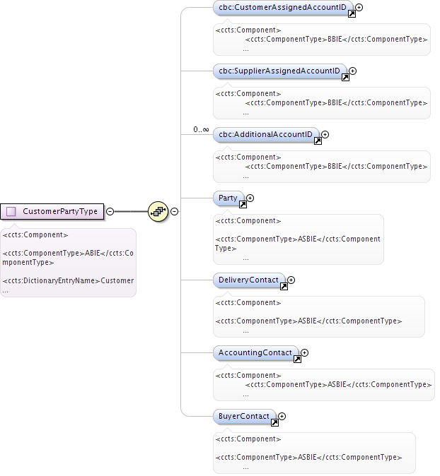 <xsd:complexType name="PartyType"><xsd:annotation><xsd:documentation><ccts:Component><ccts:ComponentType>ABIE</ccts:ComponentType><ccts:DictionaryEntryName>Party. Details</ccts:DictionaryEntryName><ccts:Definition>Information about an organization, sub-organization, or individual fulfilling a role in a business process.</ccts:Definition><ccts:ObjectClass>Party</ccts:ObjectClass></ccts:Component></xsd:documentation></xsd:annotation><xsd:sequence><xsd:element ref="cbc:MarkCareIndicator" minOccurs="0" maxOccurs="1"><xsd:annotation><xsd:documentation><ccts:Component><ccts:ComponentType>BBIE</ccts:ComponentType><ccts:DictionaryEntryName>Party. Mark Care_ Indicator. Indicator</ccts:DictionaryEntryName><ccts:Definition>Indicates whether a party is C/O (care of).</ccts:Definition><ccts:Cardinality>0..1</ccts:Cardinality><ccts:ObjectClass>Party</ccts:ObjectClass><ccts:PropertyTermQualifier>Mark Care</ccts:PropertyTermQualifier><ccts:PropertyTerm>Indicator</ccts:PropertyTerm><ccts:RepresentationTerm>Indicator</ccts:RepresentationTerm><ccts:DataType>Indicator. Type</ccts:DataType></ccts:Component></xsd:documentation></xsd:annotation></xsd:element><xsd:element ref="cbc:MarkAttentionIndicator" minOccurs="0" maxOccurs="1"><xsd:annotation><xsd:documentation><ccts:Component><ccts:ComponentType>BBIE</ccts:ComponentType><ccts:DictionaryEntryName>Party. Mark Attention_ Indicator. Indicator</ccts:DictionaryEntryName><ccts:Definition>Indicates whether a party is 'FAO' (for the attention of).</ccts:Definition><ccts:Cardinality>0..1</ccts:Cardinality><ccts:ObjectClass>Party</ccts:ObjectClass><ccts:PropertyTermQualifier>Mark Attention</ccts:PropertyTermQualifier><ccts:PropertyTerm>Indicator</ccts:PropertyTerm><ccts:RepresentationTerm>Indicator</ccts:RepresentationTerm><ccts:DataType>Indicator. Type</ccts:DataType></ccts:Component></xsd:documentation></xsd:annotation></xsd:element><xsd:element ref="cbc:WebsiteURI" minOccurs="0" maxOccurs="1"><xsd:annotation><xsd:documentation><ccts:Component><ccts:ComponentType>BBIE</ccts:ComponentType><ccts:DictionaryEntryName>Party. Website_ URI. Identifier</ccts:DictionaryEntryName><ccts:Definition>The Uniform Resource Identifier (URI) of the party.</ccts:Definition><ccts:Cardinality>0..1</ccts:Cardinality><ccts:ObjectClass>Party</ccts:ObjectClass><ccts:PropertyTermQualifier>Website</ccts:PropertyTermQualifier><ccts:PropertyTerm>URI</ccts:PropertyTerm><ccts:RepresentationTerm>Identifier</ccts:RepresentationTerm><ccts:DataType>Identifier. Type</ccts:DataType></ccts:Component></xsd:documentation></xsd:annotation></xsd:element><xsd:element ref="cbc:LogoReferenceID" minOccurs="0" maxOccurs="1"><xsd:annotation><xsd:documentation><ccts:Component><ccts:ComponentType>BBIE</ccts:ComponentType><ccts:DictionaryEntryName>Party. Logo Reference. Identifier</ccts:DictionaryEntryName><ccts:Definition>A party's logo.</ccts:Definition><ccts:Cardinality>0..1</ccts:Cardinality><ccts:ObjectClass>Party</ccts:ObjectClass><ccts:PropertyTerm>Logo Reference</ccts:PropertyTerm><ccts:RepresentationTerm>Identifier</ccts:RepresentationTerm><ccts:DataType>Identifier. Type</ccts:DataType><ccts:Examples>http://www2.coca-cola.com/images/logo.gif</ccts:Examples></ccts:Component></xsd:documentation></xsd:annotation></xsd:element><xsd:element ref="cbc:EndpointID" minOccurs="0" maxOccurs="1"><xsd:annotation><xsd:documentation><ccts:Component><ccts:ComponentType>BBIE</ccts:ComponentType><ccts:DictionaryEntryName>Party. Endpoint Identifier. Identifier</ccts:DictionaryEntryName><ccts:Definition>Identifies the end point of the routing service, e.g., EAN Location Number, GLN.</ccts:Definition><ccts:Cardinality>0..1</ccts:Cardinality><ccts:ObjectClass>Party</ccts:ObjectClass><ccts:PropertyTerm>Endpoint Identifier</ccts:PropertyTerm><ccts:RepresentationTerm>Identifier</ccts:RepresentationTerm><ccts:DataType>Identifier. Type</ccts:DataType><ccts:Examples>5790002221134</ccts:Examples></ccts:Component></xsd:documentation></xsd:annotation></xsd:element><xsd:element ref="PartyIdentification" minOccurs="0" maxOccurs="unbounded"><xsd:annotation><xsd:documentation><ccts:Component><ccts:ComponentType>ASBIE</ccts:ComponentType><ccts:DictionaryEntryName>Party. Party Identification</ccts:DictionaryEntryName><ccts:Definition>An association to Party Identification.</ccts:Definition><ccts:Cardinality>0..n</ccts:Cardinality><ccts:ObjectClass>Party</ccts:ObjectClass><ccts:PropertyTerm>Party Identification</ccts:PropertyTerm><ccts:AssociatedObjectClass>Party Identification</ccts:AssociatedObjectClass></ccts:Component></xsd:documentation></xsd:annotation></xsd:element><xsd:element ref="PartyName" minOccurs="0" maxOccurs="unbounded"><xsd:annotation><xsd:documentation><ccts:Component><ccts:ComponentType>ASBIE</ccts:ComponentType><ccts:DictionaryEntryName>Party. Party Name</ccts:DictionaryEntryName><ccts:Definition>An association to Party Name.</ccts:Definition><ccts:Cardinality>0..n</ccts:Cardinality><ccts:ObjectClass>Party</ccts:ObjectClass><ccts:PropertyTerm>Party Name</ccts:PropertyTerm><ccts:AssociatedObjectClass>Party Name</ccts:AssociatedObjectClass></ccts:Component></xsd:documentation></xsd:annotation></xsd:element><xsd:element ref="Language" minOccurs="0" maxOccurs="1"><xsd:annotation><xsd:documentation><ccts:Component><ccts:ComponentType>ASBIE</ccts:ComponentType><ccts:DictionaryEntryName>Party. Language</ccts:DictionaryEntryName><ccts:Definition>An association to Language.</ccts:Definition><ccts:Cardinality>0..1</ccts:Cardinality><ccts:ObjectClass>Party</ccts:ObjectClass><ccts:PropertyTerm>Language</ccts:PropertyTerm><ccts:AssociatedObjectClass>Language</ccts:AssociatedObjectClass></ccts:Component></xsd:documentation></xsd:annotation></xsd:element><xsd:element ref="PostalAddress" minOccurs="0" maxOccurs="1"><xsd:annotation><xsd:documentation><ccts:Component><ccts:ComponentType>ASBIE</ccts:ComponentType><ccts:DictionaryEntryName>Party. Postal_ Address. Address</ccts:DictionaryEntryName><ccts:Definition>The party's postal address.</