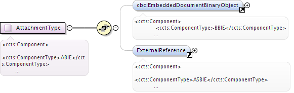 <xsd:complexType name="AttachmentType"><xsd:annotation><xsd:documentation><ccts:Component><ccts:ComponentType>ABIE</ccts:ComponentType><ccts:DictionaryEntryName>Attachment. Details</ccts:DictionaryEntryName><ccts:Definition>Information about an attached document. An attachment can be referred to externally (with the URI element) or internally (with the MIME reference element) or contained within the document itself (with the EmbeddedDocument element).</ccts:Definition><ccts:ObjectClass>Attachment</ccts:ObjectClass></ccts:Component></xsd:documentation></xsd:annotation><xsd:sequence><xsd:element ref="cbc:EmbeddedDocumentBinaryObject" minOccurs="0" maxOccurs="1"><xsd:annotation><xsd:documentation><ccts:Component><ccts:ComponentType>BBIE</ccts:ComponentType><ccts:DictionaryEntryName>Attachment. Embedded_ Document. Binary Object</ccts:DictionaryEntryName><ccts:Definition>Contains an embedded document as a BLOB (binary large object).</ccts:Definition><ccts:Cardinality>0..1</ccts:Cardinality><ccts:ObjectClass>Attachment</ccts:ObjectClass><ccts:PropertyTermQualifier>Embedded</ccts:PropertyTermQualifier><ccts:PropertyTerm>Document</ccts:PropertyTerm><ccts:RepresentationTerm>Binary Object</ccts:RepresentationTerm><ccts:DataType>Binary Object. Type</ccts:DataType></ccts:Component></xsd:documentation></xsd:annotation></xsd:element><xsd:element ref="ExternalReference" minOccurs="0" maxOccurs="1"><xsd:annotation><xsd:documentation><ccts:Component><ccts:ComponentType>ASBIE</ccts:ComponentType><ccts:DictionaryEntryName>Attachment. External Reference</ccts:DictionaryEntryName><ccts:Definition>An attached document, externally referred to, referred to in the MIME location, or embedded.</ccts:Definition><ccts:Cardinality>0..1</ccts:Cardinality><ccts:ObjectClass>Attachment</ccts:ObjectClass><ccts:PropertyTerm>External Reference</ccts:PropertyTerm><ccts:AssociatedObjectClass>External Reference</ccts:AssociatedObjectClass></ccts:Component></xsd:documentation></xsd:annotation></xsd:element></xsd:sequence></xsd:complexType>