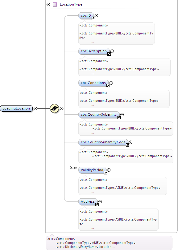 <xsd:complexType name="LocationType"><xsd:annotation><xsd:documentation><ccts:Component><ccts:ComponentType>ABIE</ccts:ComponentType><ccts:DictionaryEntryName>Location. Details</ccts:DictionaryEntryName><ccts:Definition>Information about a location.</ccts:Definition><ccts:ObjectClass>Location</ccts:ObjectClass></ccts:Component></xsd:documentation></xsd:annotation><xsd:sequence><xsd:element ref="cbc:ID" minOccurs="0" maxOccurs="1"><xsd:annotation><xsd:documentation><ccts:Component><ccts:ComponentType>BBIE</ccts:ComponentType><ccts:DictionaryEntryName>Location. Identifier</ccts:DictionaryEntryName><ccts:Definition>The unique identifier for the location, e.g., the EAN Location Number, GLN.</ccts:Definition><ccts:Cardinality>0..1</ccts:Cardinality><ccts:ObjectClass>Location</ccts:ObjectClass><ccts:PropertyTerm>Identifier</ccts:PropertyTerm><ccts:RepresentationTerm>Identifier</ccts:RepresentationTerm><ccts:DataType>Identifier. Type</ccts:DataType><ccts:Examples>5790002221134</ccts:Examples></ccts:Component></xsd:documentation></xsd:annotation></xsd:element><xsd:element ref="cbc:Description" minOccurs="0" maxOccurs="1"><xsd:annotation><xsd:documentation><ccts:Component><ccts:ComponentType>BBIE</ccts:ComponentType><ccts:DictionaryEntryName>Location. Description. Text</ccts:DictionaryEntryName><ccts:Definition>The description or name of the location.</ccts:Definition><ccts:Cardinality>0..1</ccts:Cardinality><ccts:ObjectClass>Location</ccts:ObjectClass><ccts:PropertyTerm>Description</ccts:PropertyTerm><ccts:RepresentationTerm>Text</ccts:RepresentationTerm><ccts:DataType>Text. Type</ccts:DataType></ccts:Component></xsd:documentation></xsd:annotation></xsd:element><xsd:element ref="cbc:Conditions" minOccurs="0" maxOccurs="1"><xsd:annotation><xsd:documentation><ccts:Component><ccts:ComponentType>BBIE</ccts:ComponentType><ccts:DictionaryEntryName>Location. Conditions. Text</ccts:DictionaryEntryName><ccts:Definition>Conditions describing the location.</ccts:Definition><ccts:Cardinality>0..1</ccts:Cardinality><ccts:ObjectClass>Location</ccts:ObjectClass><ccts:PropertyTerm>Conditions</ccts:PropertyTerm><ccts:RepresentationTerm>Text</ccts:RepresentationTerm><ccts:DataType>Text. Type</ccts:DataType></ccts:Component></xsd:documentation></xsd:annotation></xsd:element><xsd:element ref="cbc:CountrySubentity" minOccurs="0" maxOccurs="1"><xsd:annotation><xsd:documentation><ccts:Component><ccts:ComponentType>BBIE</ccts:ComponentType><ccts:DictionaryEntryName>Location. Country Subentity. Text</ccts:DictionaryEntryName><ccts:Definition>A territorial division of a country, such as a county or state.</ccts:Definition><ccts:Cardinality>0..1</ccts:Cardinality><ccts:ObjectClass>Location</ccts:ObjectClass><ccts:PropertyTerm>Country Subentity</ccts:PropertyTerm><ccts:RepresentationTerm>Text</ccts:RepresentationTerm><ccts:DataType>Text. Type</ccts:DataType><ccts:AlternativeBusinessTerms>AdministrativeArea, State, Country, Shire, Canton</ccts:AlternativeBusinessTerms><ccts:Examples>"Florida","Tamilnadu"</ccts:Examples></ccts:Component></xsd:documentation></xsd:annotation></xsd:element><xsd:element ref="cbc:CountrySubentityCode" minOccurs="0" maxOccurs="1"><xsd:annotation><xsd:documentation><ccts:Component><ccts:ComponentType>BBIE</ccts:ComponentType><ccts:DictionaryEntryName>Location. Country Subentity Code. Code</ccts:DictionaryEntryName><ccts:Definition>The territorial division of a country, such as a county or state, expressed as a code.</ccts:Definition><ccts:Cardinality>0..1</ccts:Cardinality><ccts:ObjectClass>Location</ccts:ObjectClass><ccts:PropertyTerm>Country Subentity Code</ccts:PropertyTerm><ccts:RepresentationTerm>Code</ccts:RepresentationTerm><ccts:DataType>Code. Type</ccts:DataType><ccts:AlternativeBusinessTerms>AdministrativeAreaCode, State Code</ccts:AlternativeBusinessTerms></ccts:Component></xsd:documentation></xsd:annotation></xsd:element><xsd:element ref="ValidityPeriod" minOccurs="0" maxOccurs="unbounded"><xsd:annotation><xsd:documentation><ccts:Component><ccts:ComponentType>ASBIE</ccts:ComponentType><ccts:DictionaryEntryName>Location. Validity_ Period. Period</ccts:DictionaryEntryName><ccts:Definition>Period(s) in which the location can be used, e.g., for delivery.</ccts:Definition><ccts:Cardinality>0..n</ccts:Cardinality><ccts:ObjectClass>Location</ccts:ObjectClass><ccts:PropertyTermQualifier>Validity</ccts:PropertyTermQualifier><ccts:PropertyTerm>Period</ccts:PropertyTerm><ccts:AssociatedObjectClass>Period</ccts:AssociatedObjectClass></ccts:Component></xsd:documentation></xsd:annotation></xsd:element><xsd:element ref="Address" minOccurs="0" maxOccurs="1"><xsd:annotation><xsd:documentation><ccts:Component><ccts:ComponentType>ASBIE</ccts:ComponentType><ccts:DictionaryEntryName>Location. Address</ccts:DictionaryEntryName><ccts:Definition>Association to the address of the location.</ccts:Definition><ccts:Cardinality>0..1</ccts:Cardinality><ccts:ObjectClass>Location</ccts:ObjectClass><ccts:PropertyTerm>Address</ccts:PropertyTerm><ccts:AssociatedObjectClass>Address</ccts:AssociatedObjectClass></ccts:Component></xsd:documentation></xsd:annotation></xsd:element></xsd:sequence></xsd:complexType>