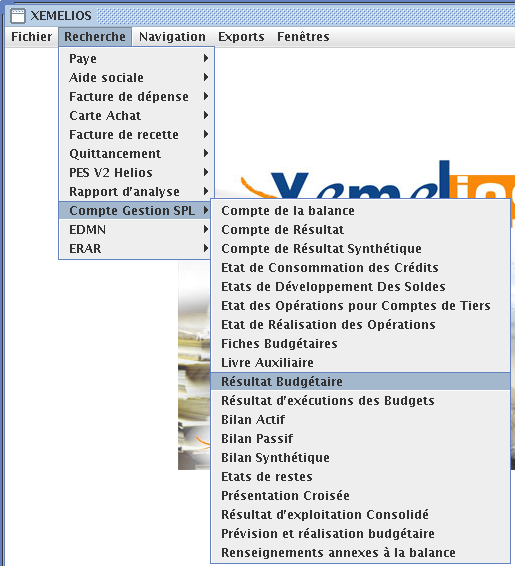 On accède aux recherches sur Résultat Budgétaire par le menu Recherche / Compte Gestion SPL / Résultat Budgétaire